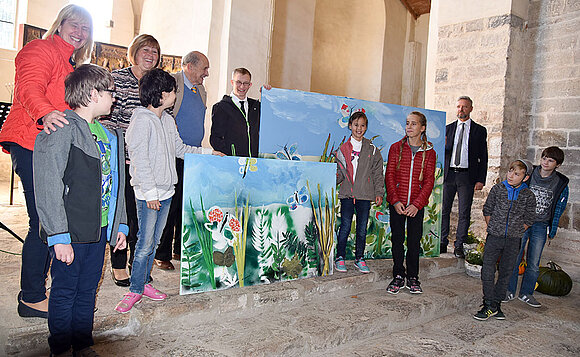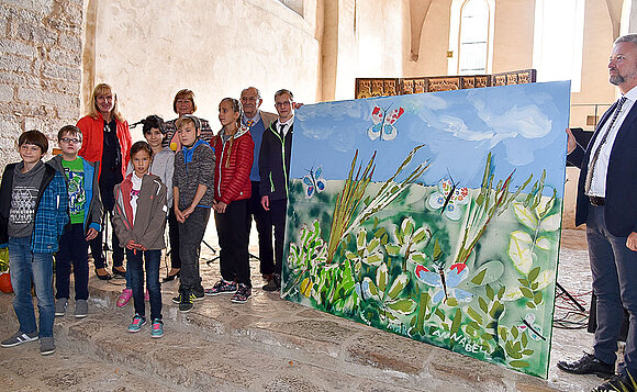 Anmerkung:Die Mitglieder des Schülerkunstprojektes übergaben Landtagspräsidentin Gabriele Brakebusch (2.v.l.) ein selbstgestaltetes Bild (2 mal 1,5 Meter) für ihr Landtagsbüro. Foto: Stefanie Böhme