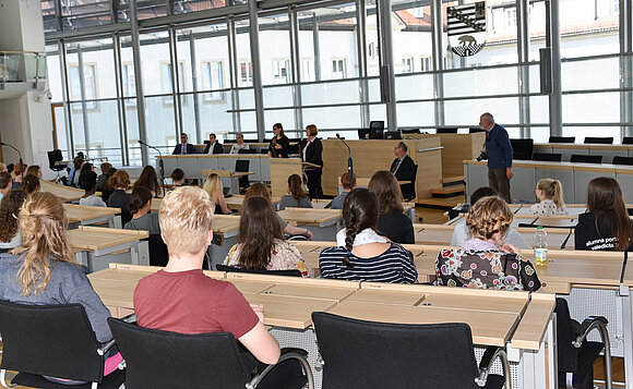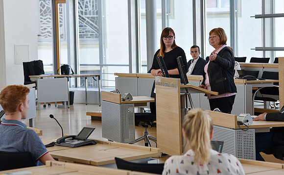 Anmerkung:Landtagspräsidentin Gabriele Brakebusch empfing 50 US-amerikanische Austauschschüler/innen im Landtag von Sachsen-Anhalt und erklärte die Arbeit des Parlaments. Foto: Stefan Müller