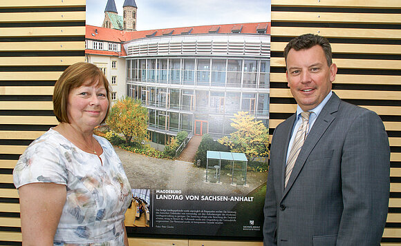 Anmerkung:Landtagspräsidenten Gabriele Brakebusch und Finanzminister André Schröder eröffneten die Ausstellung über 25 Jahre Staatliches Bauen, die ab sofort im Landtag gezeigt wird. Foto: Stefan Müller