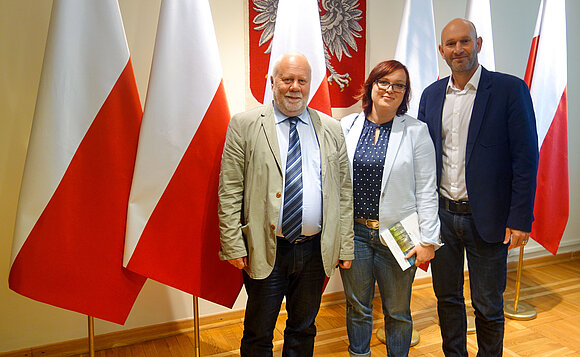Anmerkung:Die Teilnehmer der Delegationsreise des Umweltausschusses nach Warschau (v.l.): Jürgen Barth (SPD), Lydia Funke (AfD), Wolfgang Aldag (Grüne). Foto: Ulrike Brandt/Landtag