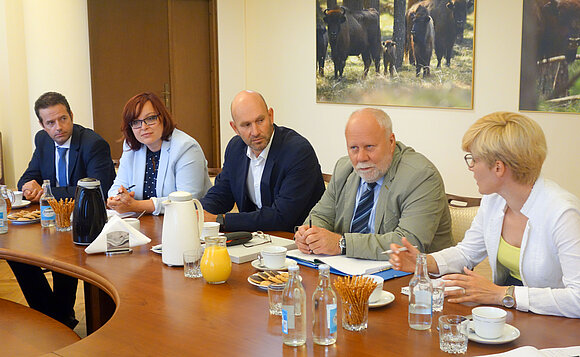 Anmerkung:Die Landtagsabgeordneten Lydia Funke (2.v.l.), Wolfgang Aldag (3.v.l.) und Jürgen Barth (2.v.r.) bei einem Gespräch zum Thema Wolf im polnischen Umweltministerium. Foto: Ulrike Brandt/Landtag