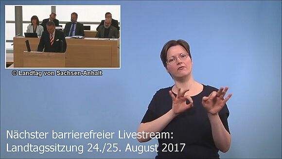 Der Landtag von Sachsen-Anhalt bietet ab der 7. Wahlperiode standardmäßig eine barrierefreie Übertragung der Landtagssitzungen im Internet an. Das bedeutet: Der übliche Livestream der Plenarsitzung wird durch einen alternativ wählbaren Livestream mit Gebärdendolmetschung ergänzt. Dazu werden die jeweiligen Dolmetscher ins herkömmliche Bild der Videoübertragung eingeblendet und ermöglichen so die barrierefreie Übertragung. Parallel dazu erscheint alles Gesprochene auch als fortlaufender Text. Die Nutzer können dabei zwischen einer fortlaufenden Textbox oder dem Text im Vollbild wählen.