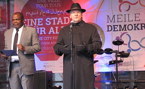 Amidou Traore vom Interkulturellen Beratungs- und Begegnungszentrum der Caritas führte wie schon in den vergangenen Jahren gekonnt durch das Bühnenprogramm am Alten Markt. „Als 1945 die Bomben auf Magdeburg fielen, hatten die Menschen nur einen Wunsch: in Sicherheit zu sein“, erinnerte der Sozialarbeiter. „Mit der Meile wollen wir an diese Hoffnung und diese Menschen erinnern“, so Traore, der zahlreiche prominente Gäste auf der Meile begrüßen konnte. Den Anfang machte Magdeburgs Oberbürgermeister Dr. Lutz Trümper.