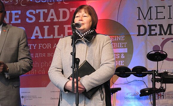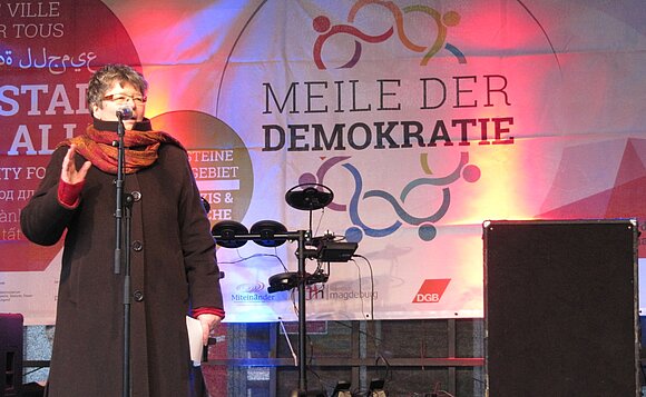 Landesbischöfin Ilse Junkermann rief die Menschen zum „Ja“ auf! Zu einem Ja zur Demokratie, zum friedlichen Miteinander, zum Respekt und zur gleichen Würde aller Menschen. Das „Nein“ zu all diesen Dingen solle in Magdeburg und Sachsen-Anhalt keinen Platz mehr finden. Zum ersten Mal wird die „Meile“ nicht von einem Neonazi-Aufmarsch negativ begleitet – darauf könne Magdeburg wirklich stolz sein, so Junkermann. Man müsse für einen Frieden weit über die eigenen Grenzen hinweg eintreten, sagte die Landesbischöfin. Sie rief dazu auf, die Vielfältigkeit der Menschen als Bereicherung für das eigene Leben wahrzunehmen; „wir müssen aufeinander zugehen und uns in den anderen hineinversetzen. Denn die Vielfalt macht unser Leben reicher!“ Nur wer sich realistisch seiner Geschichte stelle, trete gegen die Verschleierung der Gegenwart und die Gefährdung der Zukunft ein. „Deswegen: Mund auf und heftig widersprechen, wenn andere verleumdet und verunglimpft werden!“