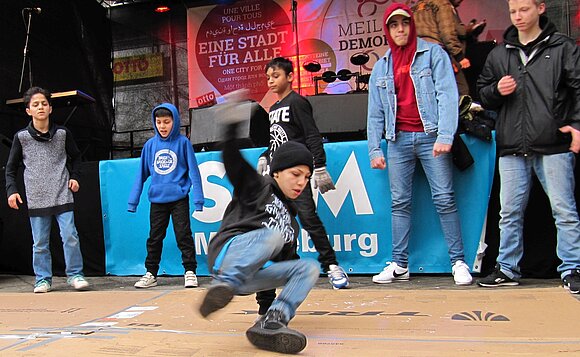Anmerkung:Junge Breakdancer eröffneten das Bühnenprogramm der Meile der Demokratie. Foto: Stefan Müller