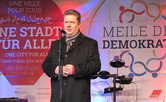 Anmerkung:Magdeburgs Oberbürgermeister hieß die Gäste der Meile der Demokratie willkommen. Foto: Stefan Müller