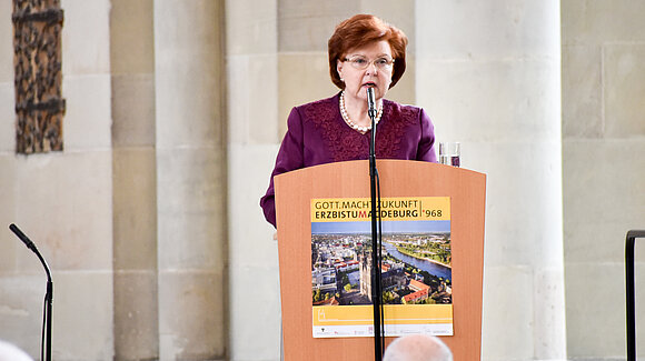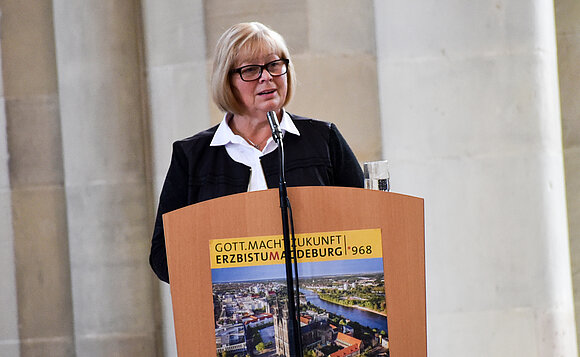 Anmerkung:Das Erzbistum Magdeburg, vor 1050 Jahren begründet, „erhielt in gewisser Weise zum ersten Mal Verfassung und Format“, sagte Landtagspräsidentin Gabriele Brakebusch. Die religiöse Verbindung des Landes habe sich auch in dessen Landesverfassung niedergeschlagen. So sei die Gründung des Erzbistums – ein Vorgang über die heutigen Landesgrenzen hinaus – auch ein Akt mit Wirksamkeit bis in die heutige Zeit hinein. „Setzen wir uns alle für eine lebenswerte, menschenfreundliche und friedliche Zukunft Europas ein“, erklärte Brakebusch.