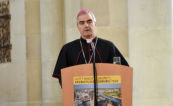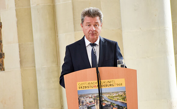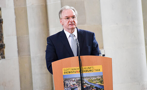 Anmerkung:Die Ausrufung des Erzbistums Magdeburg könne im heutigen Sinne als wichtiges Start-up-Unternehmen verstanden werden, denn es stehe für eine kulturelle, wirtschaftliche und politische Gemeinschaft, erklärte Ministerpräsident Dr. Reiner Haseloff. Die Stadt Magdeburg sei nach der Zerstörung im Zweiten Weltkrieg im wahrsten Sinne des Worte um den Dom herum wiederaufgebaut worden, betonte Haseloff die Bedeutung von Kirche als Institution.