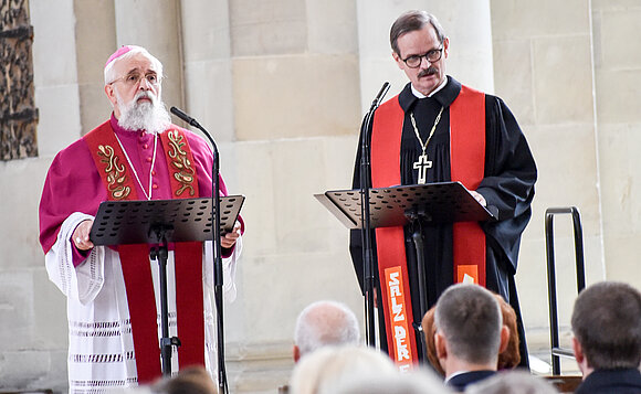 Anmerkung:Hielten eine Dialogpredigt: Bischof Gerhard Feier (l.) und Propst Christoph Hackbeil. Foto: Stefan Müller