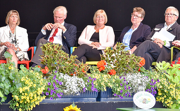 Anmerkung:Sprachen einige der Grußworte beim Symposium (v.l.n.r.): Sonnhild Noack, Geschäftsführerin der LAGA, Dr. Christoph von Klatte, Geschäftsführer der Gartenakademie Sachsen-Anhalt, Landtagspräsidentin Gabriele Brakebusch und Umweltministerin Prof. Dr. Claudia Dalbert.Foto: Stefanie Böhme