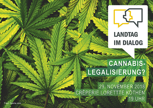 Im Rahmen der Veranstaltungsreihe „Landtag im Dialog“ werden sich am 29. November 2018, 19 Uhr, in der Crêperie Lorette in Köthen (Bernburger Straße 58) Mitglieder des Landtagsausschusses für Inneres und Sport den Fragen und Meinungen der Bürgerinnen und Bürger zum Thema „Cannabislegalisierung?!“ stellen und mit ihnen diskutieren. Auf Einladung von Landtagspräsidentin Gabriele Brakebusch werden: Tobias Krull (CDU), Hagen Kohl (AfD), Henriette Quade (DIE LINKE), Rüdiger Erben (SPD) und Sebastian Striegel (BÜNDNIS 90/DIE GRÜNEN) an der Bügerdialogrunde teilnehmen. Die Diskussion moderiert Stephan Schulz (mdr).