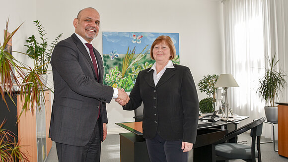 Erstmals zu Gast im Landtag von Sachsen-Anhalt: S.E. Ali Abdulla Mohamed Saeed Al Ahmed, Botschafter der Vereinigten Arabischen Emirate. Die Begrüßung erfolgte durch Landtagspräsidentin Gabriele Brakebusch. Foto: Stefanie Böhme