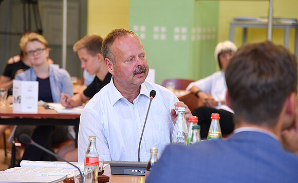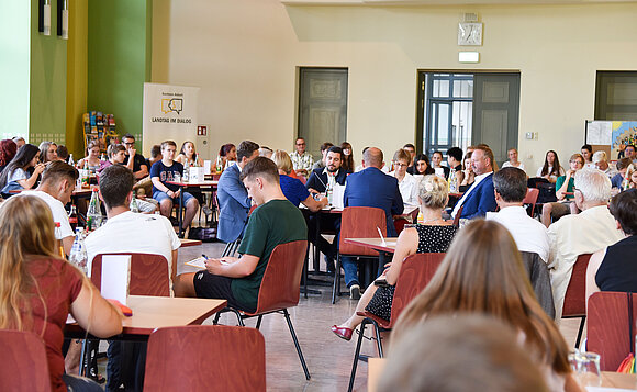 Anmerkung:Diskutiert wurde an einem Tisch in der Mitte des Saals. Der leere Stuhl war für Bürgerinnen und Bürger gedacht, die sich direkt am Dialog beteiligen wollten. Foto: Stefanie Böhme