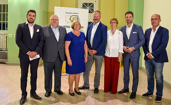 Anmerkung:Gruppenbild mit Damen: Landtagspräsidentin Gabriele Brakebusch (3.v.l.) hatte ihre Landtagskollegen Tobias Rausch, Ronald Mormann, Wulf Gallert, Dorothea Frederking und Florian Philipp (v.l.n.r.) zur Dialogveranstaltung eingeladen. Es moderierte Stephan Schulz (r.). Foto: Stefanie Böhme
