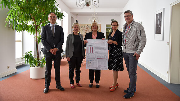 Robert Glinski (l., Mechthild-Grundschule Magdeburg), Dr. Martina Vetter (2.v.r., Elisabeth-Gymnasium Halle) und Boris Mocek (r., Saale-Schule Halle) überreichten Landtagspräsidentin Gabriele Brakebusch (M.) und Christina Buchheim (2.v.l., Vorsitzende des Petitionsausschusses) symbolisch ihre Petition im Landtag. Foto: Stefanie Böhme