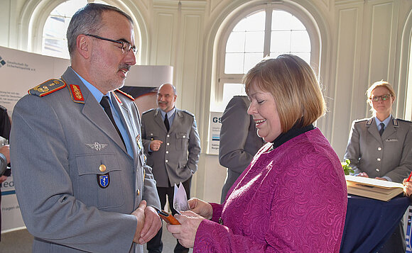 Anmerkung:Generalstabsarzt Dr. Ulrich Baumgärtner Kommandeur Kommando Sanitätsdienstliche Einsatzunterstützung Weißenfels begrüßt Landtagspräsidentin Gabriele Brakebusch beim Jahresempfang seines Kommandos im Goethegymnasium Weißenfels. Foto: Stefanie Böhme