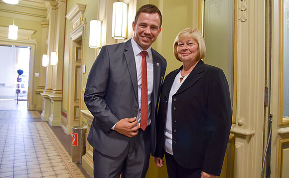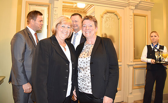 Anmerkung:Aus Berlin angereist: SPD-Bundestagsabgeordnete für Sachsen-Anhalt, Katrin Budde (l.). Sie ist unter anderem Mitglied im Ausschuss für Ernährung und Landwirtschaft. Kurz vor Beginn der Gala traf sie Landtagspräsidentin Gabriele Brakebusch. Foto: Stefanie Böhme