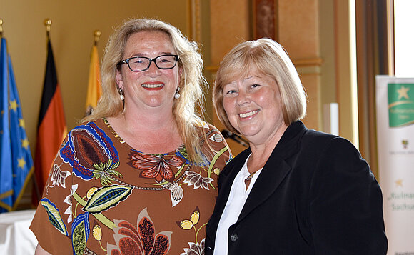 Anmerkung:Landtagspräsidentin Gabriele Brakebusch trifft Landwirtschaftsministerin Prof. Dr. Claudia Dalbert (r.) kurz vor Beginn der Galaveranstaltung zur Verleihung des „Kulinarischen Sterns“ 2018.Foto: Stefanie Böhme