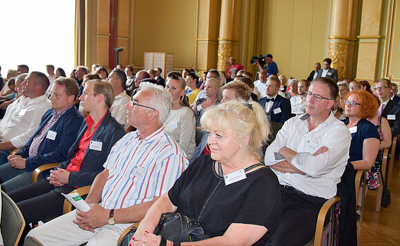 Anmerkung:Mehr als 100 Produkte hatten sich 2018 um 15 kulinarische Sterne beworben. Vertreter der Unternehmen warteten im Festsaal des Palais am Fürstenwall gespannt auf die Bekanntgabe der Gewinner. Foto: Stefanie Böhme