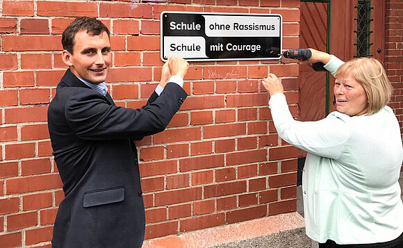 Anmerkung:Landtagspräsidentin Gabriele Brakebusch und der Schulleiter des Neuen Städtischen Gymnasiums Halle, Jan Riedel, bringen gemeinsam die offizielle Plakette an. Foto: Steve Mämecke