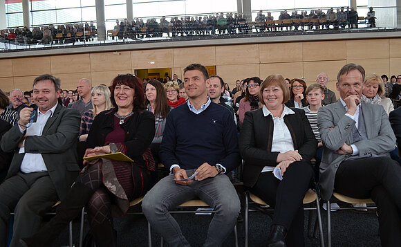 Anmerkung:Landtagspräsidentin Gabriele Brakebusch (4.v.l.) flankiert von sportlichen Größen: Handball-Nationaltrainer Christian Prokop und Hans-Joachim Watzke, Geschäftsführer des Fußball-Bundesligisten Borussia Dortmund. Foto: LpB