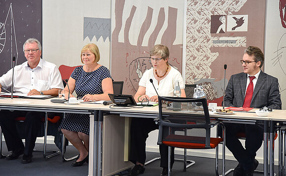 Anmerkung:Netzwerktreffen zur Aufarbeitung der SED-Diktatur in Sachsen-Anhalt und Niedersachsen. v.l.n.r: Hartmut Büttner MdB a.D, Niedersachsen; Landtagspräsidentin Gabriele Brakebusch; Brigit Neumann-Becker, Landesbeauftragte für die Aufarbeitung der SED-Diktatur in Sachsen-Anhalt (LzA); Dr. Wolfgang Laßleben, Mitarbeiter der LzA. Foto: Stefanie Böhme