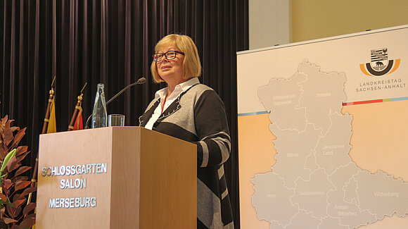 Landtagspräsidentin Gabriele Brakebusch sprach auf der Landkreisversammlung ein Grußwort. Foto: Landkreis Saalekreis