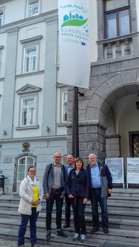 Ljubljana erhielt 2016 den Titel „European Green City“ verliehen. Was das konkret bedeutet, erfuhren die Landtagsabgeordneten (v.l.: Lydia Funke, Wolfgang Aldag, Carsten Borchert, Silke Schindler und Jürgen Barth, hier vor dem Rathaus) bei ihrer Reise nach Slowenien. Foto: Ulrike Brandt/Landtag