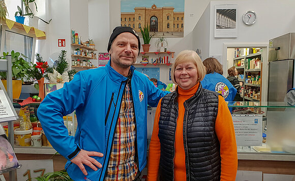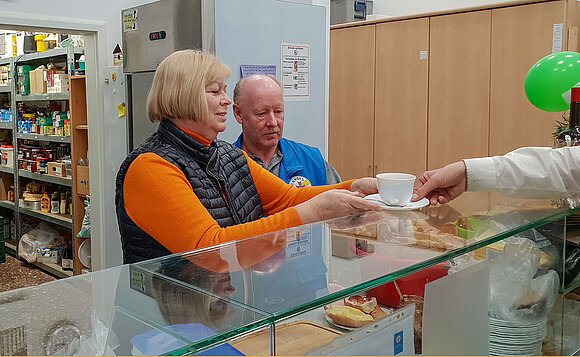 Anmerkung:Landtagspräsidentin Gabriele Brakebusch hinter der Theke im Gespräch mit einem Mitarbeiter der Bahnhofsmission Magdeburg. Foto: Stefanie Böhme