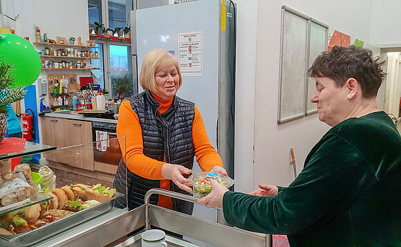 Anmerkung:Landtagspräsidentin Gabriele Brakebusch hilft bei der Frühstücksausgabe in der Bahnhofsmission Magdeburg. Foto: Stefanie Böhme
