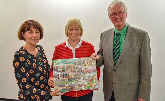 Anmerkung:Landtagspräsidentin Gabriele Brakebusch (M.) wurde von BSSA-Präsident Dr. Volkmar Stein und der Geschäftsführerin des Verbands Andrea Holz mit einer Collage über die Landessportspiele 2019 überrascht, an denen die Landtagspräsidentin nicht hatte teilnehmen können. Foto: Stefan Müller