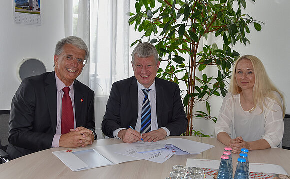Anmerkung:Dr. Nico Kock, stellvertretender Geschäftsführer von "Jugend forscht" (l.), Dr. Michael Hahn Geschäftsführer der ECH Elektrochemie Halle GmbH und Claudia Ohm vom TGZ Halle Technologie- und Gründerzentrum Halle GmbH unterzeichnen im Landtag neue Patenschaftsverträge. Foto: Stefanie Böhme