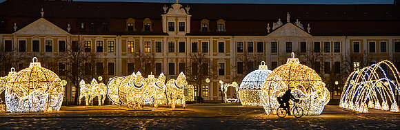 Blick auf die Lichterwelten auf dem Domplatz in Magdeburg, im Hintergrund: der Landtag von Sachsen-Anhalt. Foto: Stefan Müller