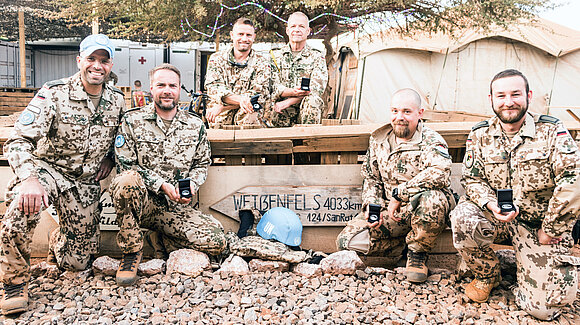 „Ich werde die Medaille gleich nach Hause zu meiner Familie nach Weißenfels schicken“, sagt Oberstleutnant Robert H., der zurzeit in Gao stationiert ist. „Denn von unseren Familien daheim erhalten wir die größte Unterstützung. Sie halten uns den Rücken frei. Unsere Frauen, Kinder, Eltern und Freunde sind nämlich genauso im Auslandseinsatz wie wir.“