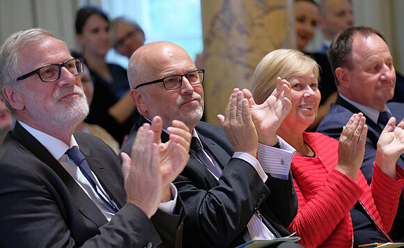 Anmerkung:Viel Applaus gab es für die jungen Musikerinnen und Musikern auch von Staats- und Kulturminister Rainer Robra, dem Präsidentin des Landesmusikrates Gerhart Miesterfeldt, Landtagspräsidentin Gabriele Brakebusch und dem IHK-Präsidenten Prof. Dr. Steffen Keitel (v.l.). Foto: IHK Halle-Dessau/Michael Deutsch