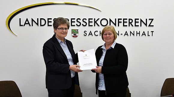 Die Landesbeauftragte zur Aufarbeitung der SED-Diktatur, Birgit Neumann-Becker (l.) übergab kürzlich ihren Tätigkeitsbericht 2018/2019 an Landtagspräsidentin Gabriele Brakebusch. Foto: Stefan Müller.