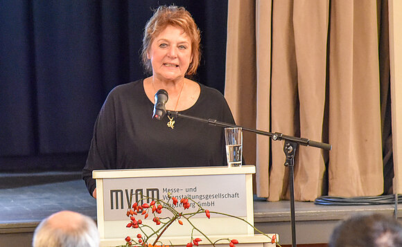 Anmerkung:Landtagspräsidentin Gabriele Brakebusch während ihres Grußworts bei der Festveranstaltung in Magdeburg. Foto: Stefan Müller