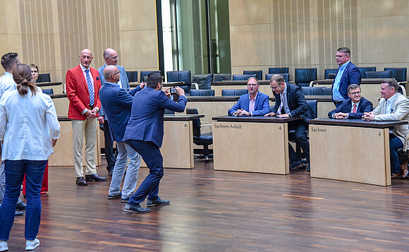 Im Anschluss an die Sitzung des Ausschusses gab es für die Dame und die Herren noch eine Führung durch das Gebäude, inklusive Besuch im Plenarsaal, in dem sich regelmäßig die Vertreterinnen und Vertreter der 16 deutschen Länder für Verhandlungen treffen.