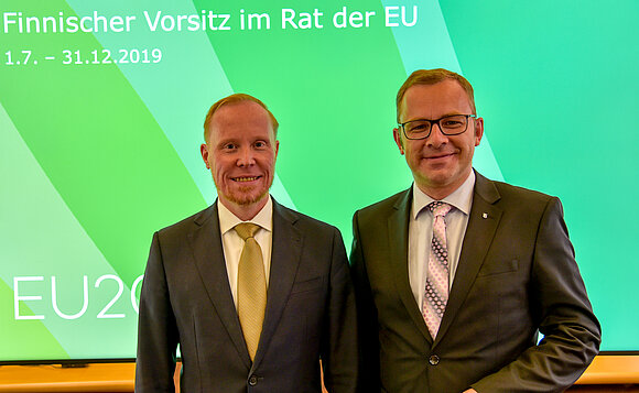 Anmerkung:Ausschussvorsitzender Daniel Sturm (r.) und der Gesandte der finnischen Botschaft Dr. Antti Kaski am Rande der Ausschusssitzung im Bundesrat. Foto: Stefan Müller