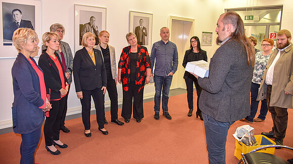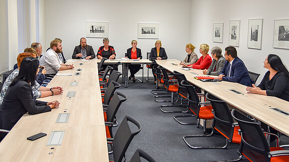 Landtagspräsidentin Gabriele Brakebusch (4.v.l.) und die Vorsitzende des Petitionsausschusses Christina Buchheim (2.v.l.) nahmen eine Petition gegen die Kürzungen in der Jugendarbeit entgegen. Foto: Stefan Müller