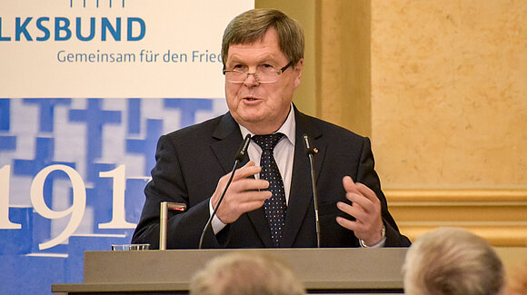 Eigentlich sei der 100. Geburtstag des Volksbunds gar kein Grund zum Feiern, sagte Dieter Steinecke, denn seine Gründung sei mit dem Ersten Weltkrieg einer großen Niederlage für Menschlichkeit und Frieden vorausgegangen. Mit dem vom Volksbund eingeführten Volkstrauertag habe man versucht, Leid zu lindern, Wunden zu heilen, die Abkehr vom Hass und die Hinkehr zur Liebe zu feiern. Es müsse Schluss damit sein, das Gestrige ewigmachen zu wollen, so Steinecke. Das Erbe der Vergangenheit sei nicht zu ignorieren. Noch immer fragten Angehörige nach im Krieg Vermissten oder Gefallenen.