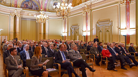 Der Festsaal in der Magdeburger Staatskanzlei war voll, die Festredner des Lobes voll für den Volksbund Deutsche Kriegsgräberfürsorge. Foto: Stefan Müller