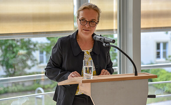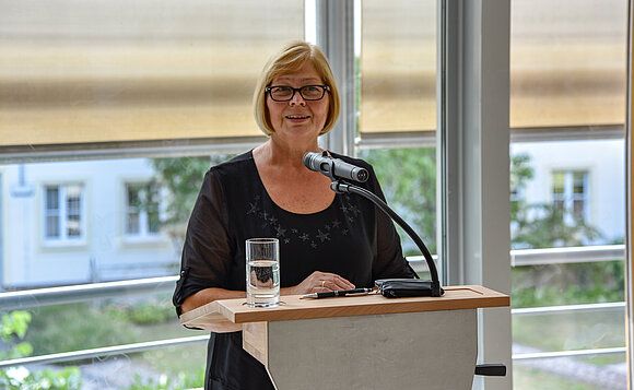 Anmerkung:Landtagspräsidentin Gabriele Brakebusch während ihrer einführenden Worte zur neuen Ausstellung im Landtag. Foto: Stefan Müller