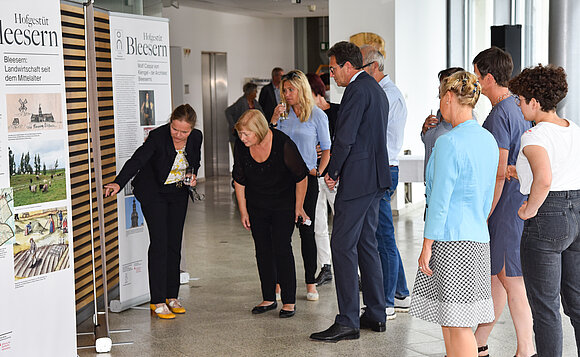 Anmerkung:Dr. Christiane Henne (l.) führte durch die Ausstellung, auch Landtagspräsidentin Gabriele Brakebusch (2.v.l.) hörte genau hin. Foto: Stefan Müller
