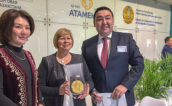 Anmerkung:Freuten sich über ein Wiedersehen auf der Grünen Woche: Landtagspräsidentin Gabriele Brakebusch (M.) und der Botschafter der Republik Kasachstan. Foto: Katja Schmidt/Landtag von Sachsen-Anhalt
