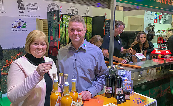 Anmerkung:Auf der Grünen Woche präsentierten sich 86 verschiedene Aussteller aus Sachsen-Anhalt, darunter auch ein Hersteller von vitaminreichen Säften. Foto: Steve Mämecke/Landtag von Sachsen-Anhalt