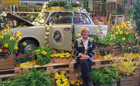 Anmerkung:Landtagspräsidentin Gabriele Brakebusch sitzt in einem Meer von Blumen auf der Grünen Woche in Berlin. Foto: Katja Schmidt/Landtag von Sachsen-Anhalt