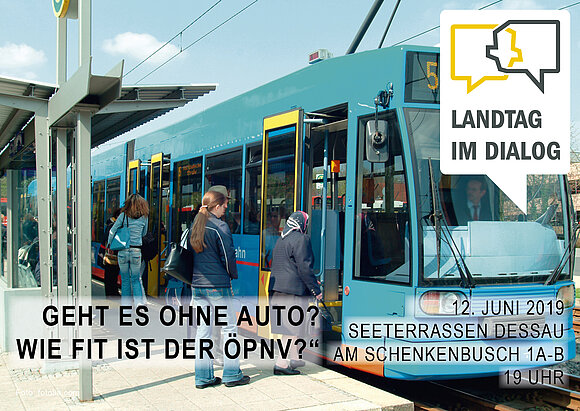 Die Reihe „Landtag im Dialog“ macht am 12. Juni 2019 um 19 Uhr Station auf den Seeterrassen Dessau (Am Schenkenbusch 1a-b, Dessau-Roßlau). Unter dem Titel „Geht es ohne Auto? Wie fit ist der ÖPNV?“ wollen Abgeordnete aller im Landtag vertretenen Fraktionen mit Bürgerinnen und Bürgern darüber ins Gespräch kommen, wie es um die Zukunft des ÖPNV in Sachsen-Anhalt bestellt ist.