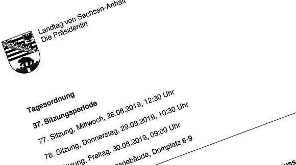 Die Tagesordnung für die 37. Sitzungsperiode des Landtags von Sachsen-Anhalt in der 7. Wahlperiode ist so vollgepackt, dass sich die Mitglieder des Ältestenrats auf drei Sitzungstage geeinigt haben. Auf der Agenda stehen nicht weniger als 33 Tagesordnungspunkte, die vom 28. bis 30. August 2019 im Plenarsaal in Magdeburg behandelt werden sollen – darunter zahlreiche Gesetzentwürfe in Erster oder Zweiter Beratung, Anträge, Große Anfragen und Aktuelle Debatten.