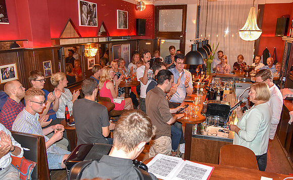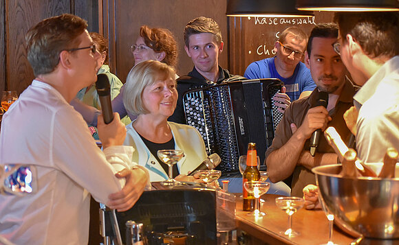 Anmerkung:Landtagspräsidentin Gabriele Brakebusch war begeistert von der ersten Auflage der „Bar der Ideen“ in Magdeburg, die musikalisch von Christian Waltenberg am Akkordeon umrahmt wurde. Foto: Stefanie Böhme